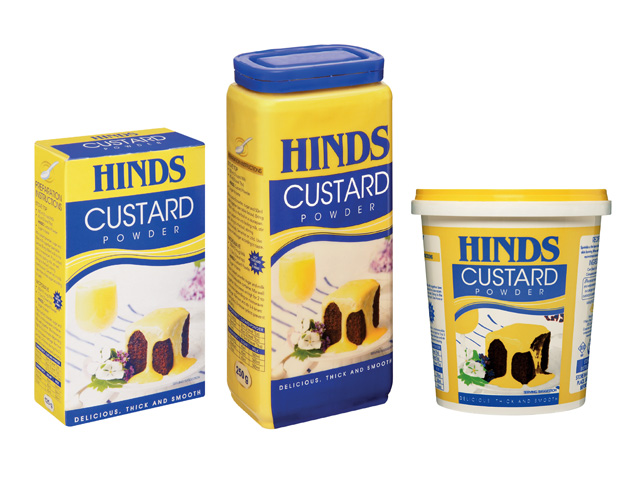 Hinds Custard Powder available in a 500g canister, 250g and 125g cartons